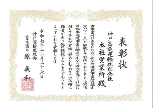 「安全性優良事業所(Gマーク)神戸運輸監理部 兵庫陸運部長表彰」を授与いたしました